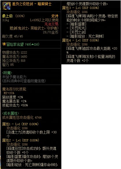 答:1御龙决 武器魔攻算亮点,冰属性略坑。韩服改版技能是否加成暗帝暂时不确定,不过对于百分比的暗帝来说可以完全用了。2释魂之真灵短剑 我们可以看出各种属性在现在镇魂的基础上有所提升,就基础属性而言,同级传说级武器是高于。